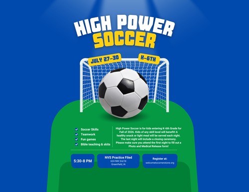 High Power Soccer is back! Join us July 27–30 for an exciting week where kids will develop their soccer skills while also learning about God. Each evening will be filled with skill-building, games, and great fellowship.