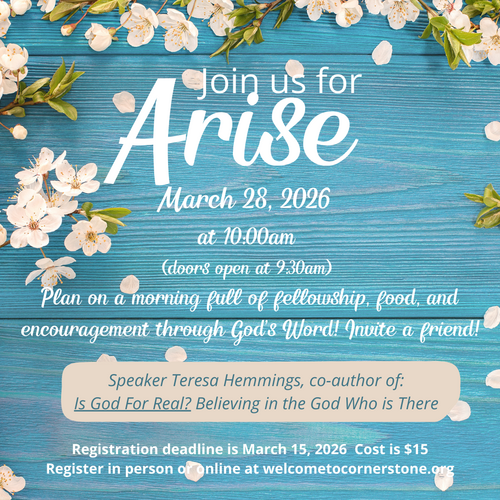 We invite you to be part of Arise, our annual event designed to bring women together for a morning of encouragement, reflection, and connection. This special gathering will feature finger foods(prepared and served by men of our church), a time of praise and worship, and a message centered on the resurrection of Jesus. Arise is an opportunity for women at all stages of their spiritual walk; whether you're new to your faith or seeking encouragement in your walk with the Lord, this event is designed to uplift and inspire. We look forward to sharing this unforgettable morning with you. This is a great opportunity to invite guests. Register online today and join us!