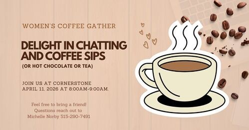 On Saturday, April 11th from 8:00–9:00 AM, start your morning with good conversation and a warm cup of coffee (or hot chocolate or tea). Feel free to invite a friend to join you!