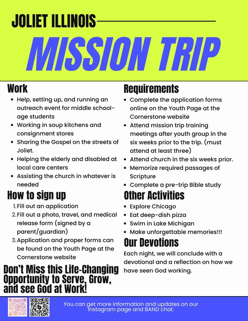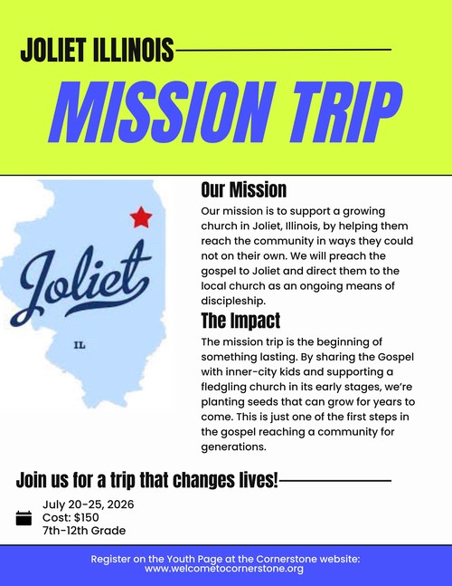 Join Cornerstone Fellowship Youth Group for our 2026 summer mission trip to Joliet, Illinois, from July 20–25! Our mission is to support a church plant by helping them reach the community in ways they could not on their own. Students will have the opportunity to serve the needy and homeless, work with youth, and share the Gospel. The cost for the trip is $150, and eligibility is open to students in 7th–12th grade from the 2025–2026 school year.