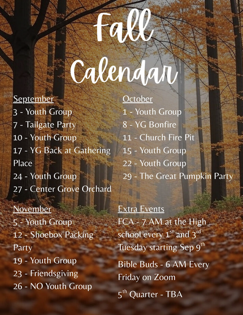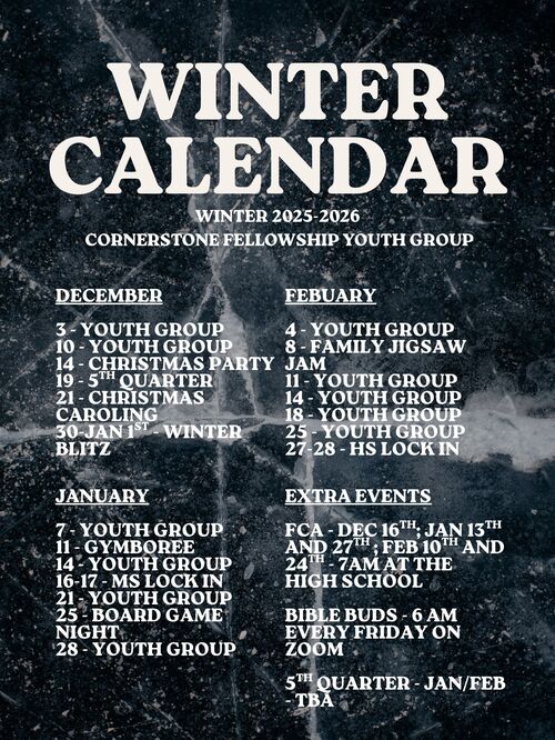 We put out a Spring, Summer, Fall, and Winter Calendar. Check out what is up next for Cornerstone Fellowship Youth!